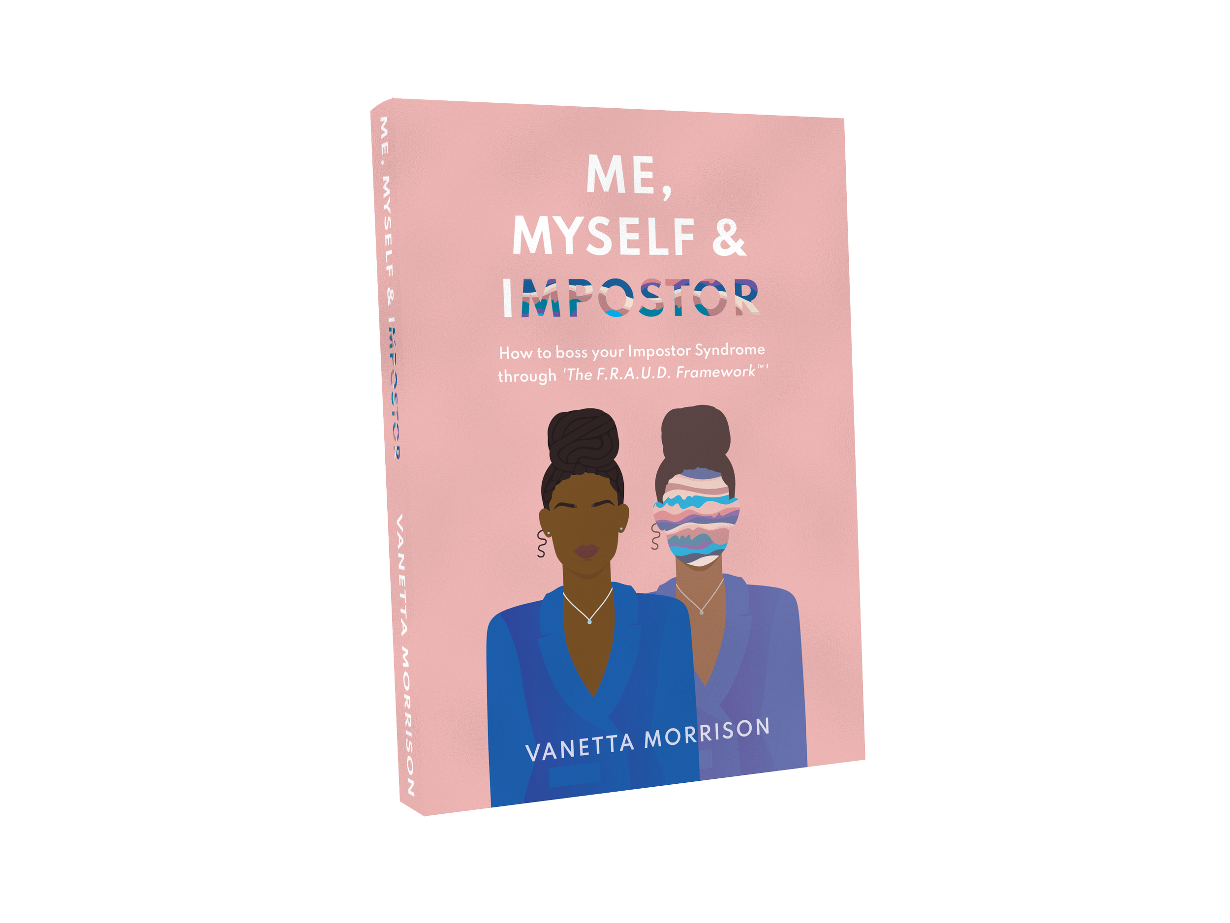 Cover design created for book entitled “Me, Myself and Impostor: How to boss your Impostor Syndrome through 'The F.R.A.U.D. Framework™'”. Preliminary sketches explored the idea of someone who feels like an impostor, wearing a mask and not being able to show up as their true selves. This mask was made by creating a wave-like pattern with brand colours, which was likened to a storm, representing someone facing an inner battle. The “shadow concept” was eventually chosen, whereby the “impostor” was illustrated to be hovering over an individual’s shoulder, which explains the two characters displayed on the cover.