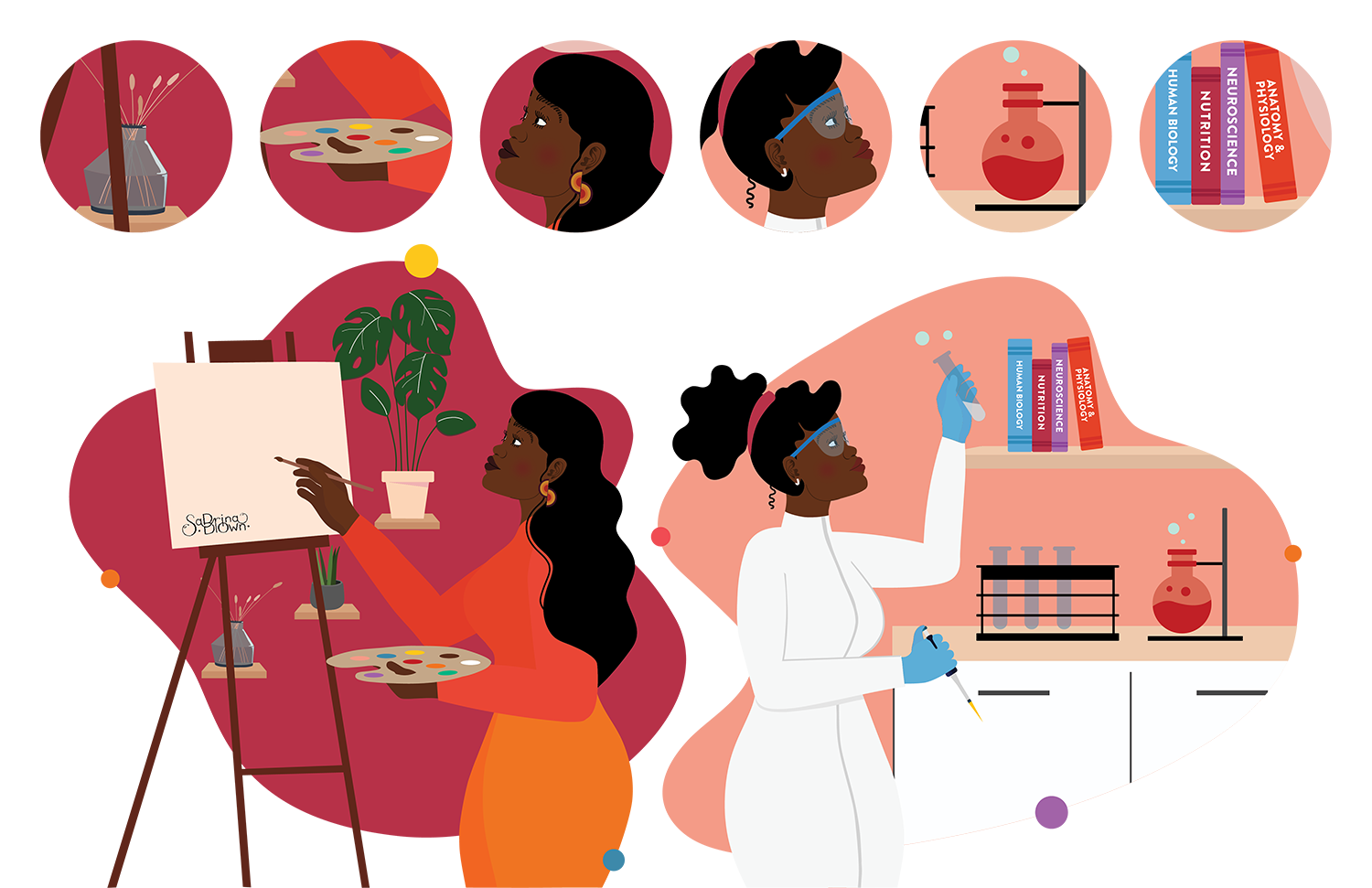 Vector illustrations drawn digitally in Adobe Illustrator, with abstract shapes revealing a portion of the environment or world that each character resides in: The scientist’s laboratory and the artist’s studio.